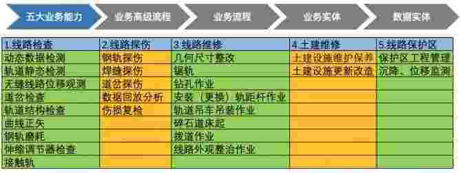 在轨道运维业务中,,,,,,,,我们形成了完整的从业务能力(业务域)-业务流程-业务实体-数据模型的分析梳理过程。。。。。。轨道运维业务能力如下图所示:::::::::::